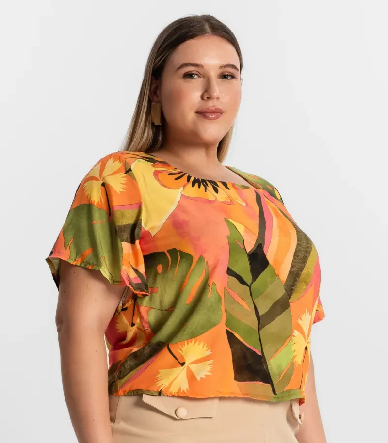 A Blusa Feminina Plus Size Estampada Secret Glam é uma peça cheia de estilo e elegância, confeccionada em ribana canelada lurex viscose Khyara, um tecido macio e de caimento impecável. Suas mangas assimétricas conferem um toque moderno e fashion, enquanto o detalhe de amarração em friso nas costas adiciona um charme extra à peça. A estampa exclusiva traz personalidade e sofisticação, tornando essa blusa ideal para looks casuais e sofisticados, garantindo conforto e confiança em qualquer ocasião.