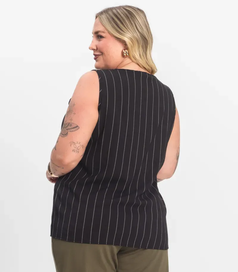 Regata confeccionada em tecido visco com estampa de listras verticais, leve e confortável, ideal para dias quentes. Possui decote arredondado e cavas com acabamento em friso, garantindo mais delicadeza e resistência. A barra conta com bainha fina e acabamento limpo, que proporciona um caimento fluido e um visual moderno. Uma peça versátil que combina com diferentes estilos e ocasiões.