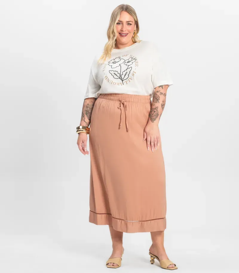 A saia midi plus size Secret Glam é confeccionada em viscose Double Yarn Solid, proporcionando toque macio e caimento fluido. Com entremeio delicado, adiciona um charme especial ao design, valorizando a peça com sofisticação. Seu comprimento midi alia conforto e elegância, ideal para diversas ocasiões, do dia a dia a eventos mais especiais. Versátil e estilosa, é uma escolha perfeita para mulheres que buscam conforto e beleza na moda plus size.